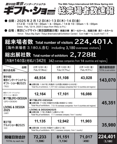 東京國際禮品展有49年(每年2回)98回舉辦的貿易展(實績),有被到場的流通業者的采購權限者約100萬人的登記。受邀的采購商會與展商進行現場面對面的洽談。